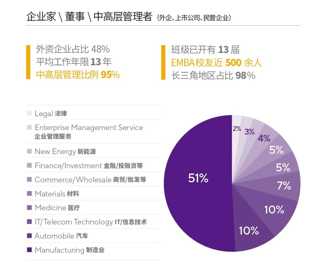 校友有多位美国政界商界名流,项目在中国已有13届校友,为长三角地区的各大外资企业,上市公司和优秀民企培养了高级管理者,也为在创业道路上的新兴企业家建立了系统的学习体系。
